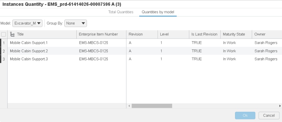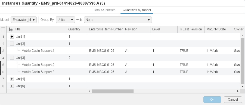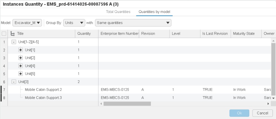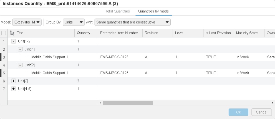 While working with the 150% Engineering Definition, the unit effectivity can be applied and further consumed by downstream applications to retrieve useful information. For example, the manufacturing team can benefit from the unit effectivity definition to identify the quantity of products required for a given unit(s). The procurement team can identify quantity of products to be purchased for a given unit(s). This can be easily achieved through grouping of the instances based on units.