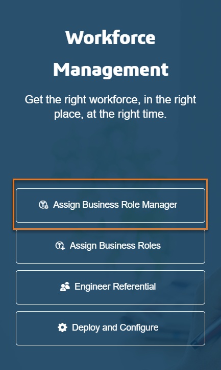 As a result of this assignment, the ''Assign Business Role Manager' ' menu becomes available to you on the 'Workforce Management' application home page.