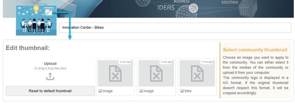 - The logo: By clicking in “Change”, you can select and upload a new community logo. You can either browse for a file or just drop your file into the Drop your files from your desktop or click here: section.