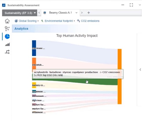 The Analytics tab in the Sustainability Assessment app allows you to view analytics for the phase-wise distribution, environmental footprint breakdown, and most impacting human activities. The Sankey diagram shows the top ten human activities contributing to the selected environmental metric.
