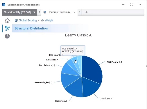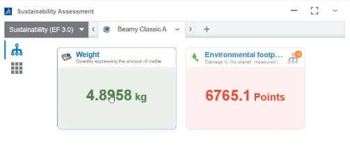 The weight of the product and it's parts is the key contributing factor to calculate the score of the sustainability assessment. The calculated or declared weight during the design phase of the product seamlessly integrates with the activities from the ecoinvent database.