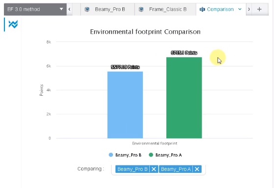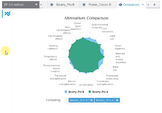 You can create revisions of the products and compare their environmental impact to take better decisions and comply with the set environmental footprint targets. The “Add to Comparison” option in the app allows you to begin the comparison. The spider chart is displayed that shows the comparison of each environmental metric value of the selected revisions. You can click on any of the metric to view the result in the bar chart form.