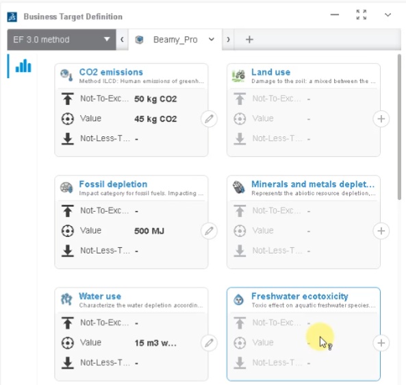 The “Business Target Definition” app allows you to set up the goal and scope definition i.e. you can set up “Target Value”, “Minimum Permissible Value”, and “Maximum Permissible Value” for all the environmental metrics depending on the environmental method you’ve chosed.