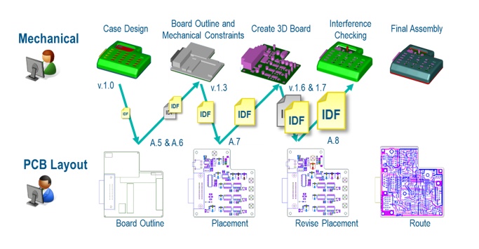 IDF defines a specification for exchanging data between electrical and mechanical systems for use in 3D design and analysis of Printed Circuit Board (PCB) designs. This allows users of these systems to participate concurrently in the design of electro-mechanical products, resulting in development flows loosely based on the illustration below.