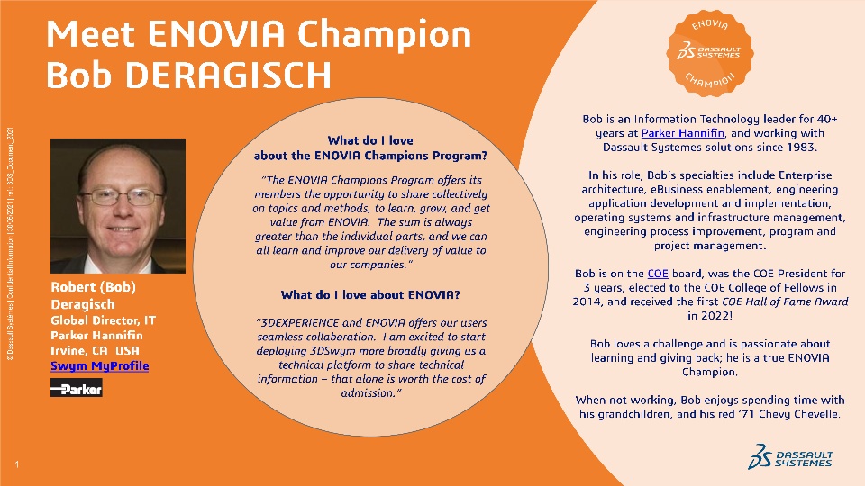 Robert (Bob) Deragisch, is the Global Director, IT at Parker Hannifin based in Irvine, CA USA. Bob has been working with Dassault Systemes solutions since 1983, and his commitment, passion, and experience is second to none.