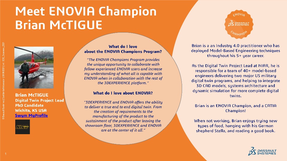 "The ENOVIA Champions Program provides the unique opportunity to collaborate with fellow experienced ENOVIA users and increase my understanding of what all is capable with ENOVIA when in collaboration with the rest of the 3DEXPERIENCE platform.”