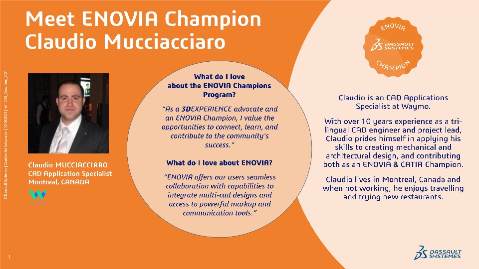 Claudio Mucciacciaro, currently a CAD Application Specialist at WAYMO, demonstrates skill, creativity, and selflessness in all that he does. With over 10 years experience including CATIA, ENOVIA & 3DEXPERIENCE, Claudio offers our ENOVIA user community a wealth of knowledge and a passion to collaborate - in 3 languages!