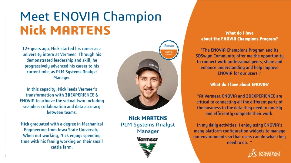 As a result of 12 years of demonstrated skill and leadership, today Nick leads Vermeer’s transformation with 3DEXPERIENCE & ENOVIA on the Cloud to achieve the Virtual Twin including seamless collaboration and data accuracy between teams.
