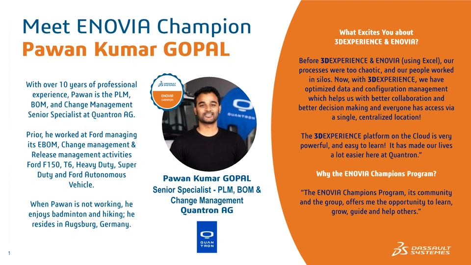 Thank you for being a value ENOVIA Champion, Pawan, and for taking this interview which we hope will inspire others in their 3DEXPERIENCE and ENOVIA journeys!