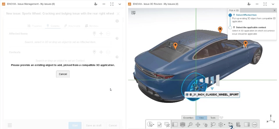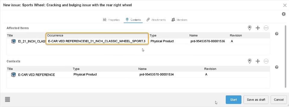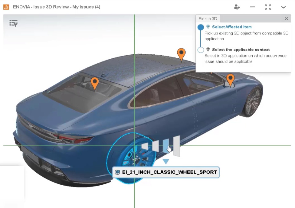 Starting from the R2022x FD03 release, you can raise an issue directly on a specific product instance. You can also capture the instance and its occurrence path in the issue definition. This is available in the Issue 3D Review app where you can select the specific instance, followed by applicable context of the issue.