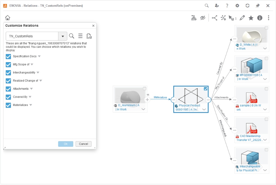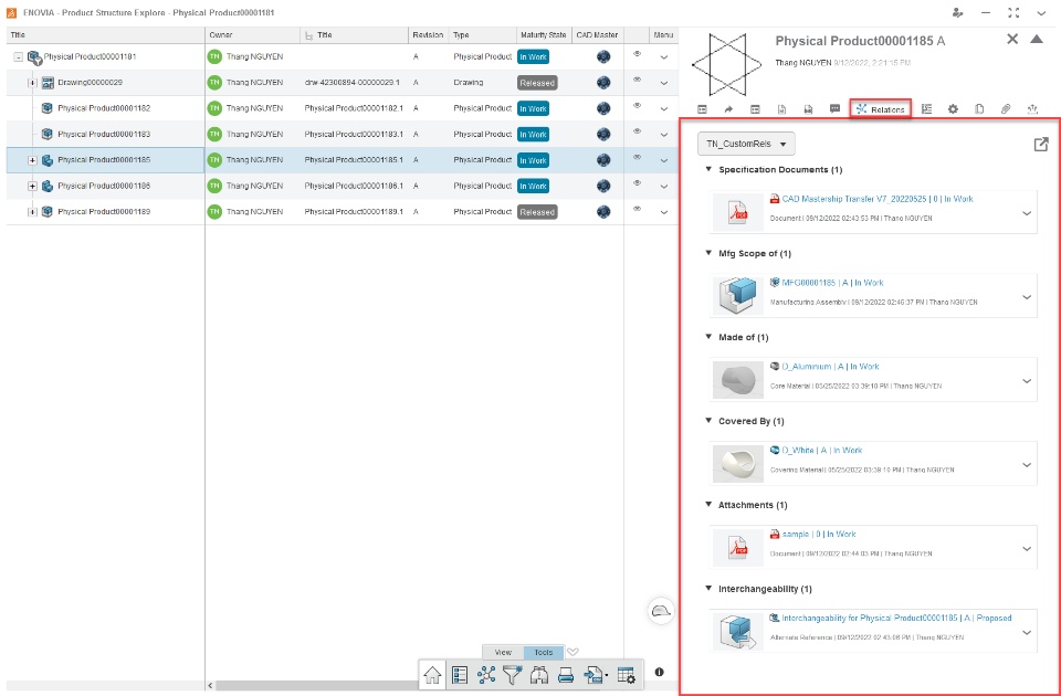 - Example of how we normally see an item's relations but selecting the custom Relations Set: