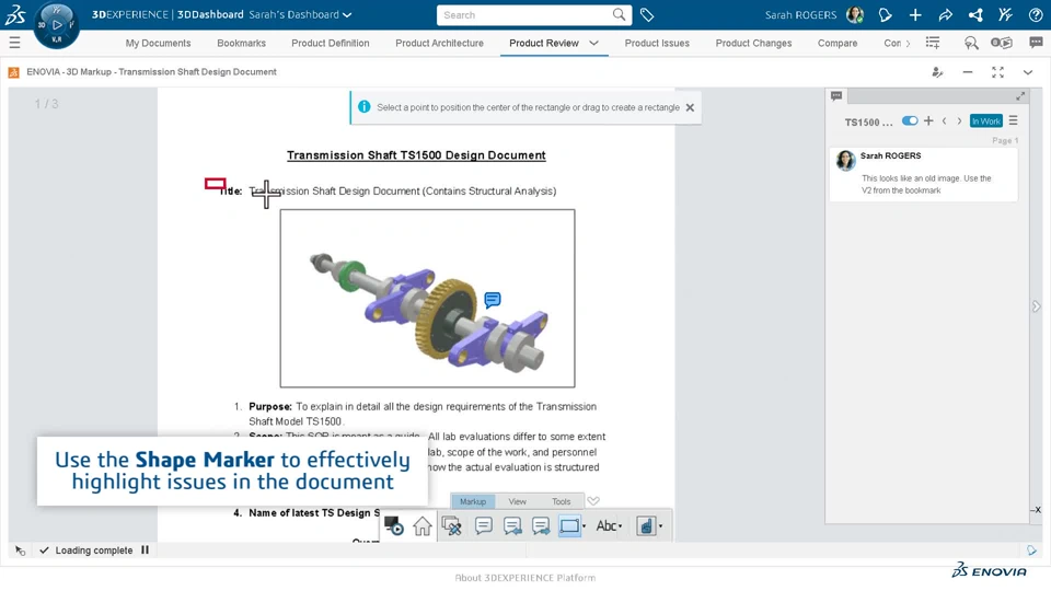 Reviewers can use the Design Review app to document their review observations on requirements using various shape markers and comments. All the comments are consolidated under the selected markup in the comments panel. Further, reviewers can also collaborate and respond to each other’s comments using the Reply option. Once the review is complete, you can promote the maturity of the review to the Frozen state.