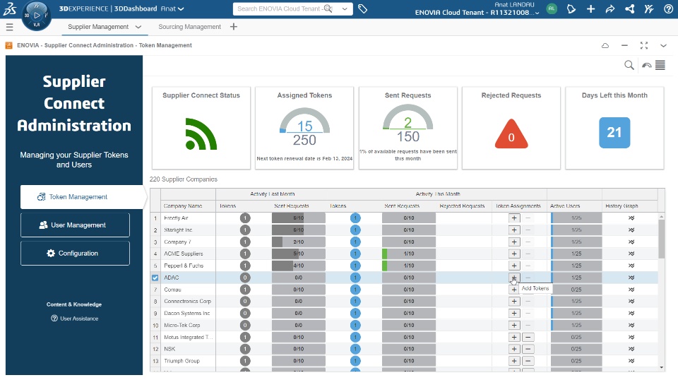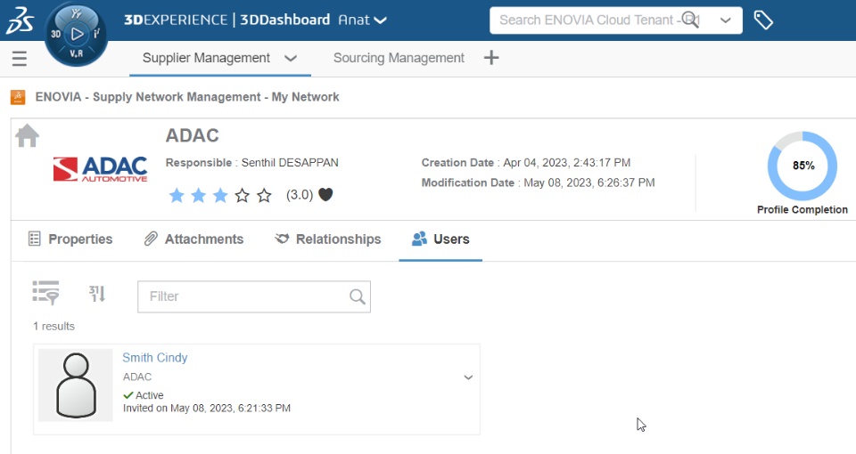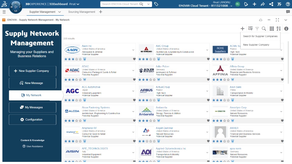 - The Supply Network Management app, which allows you to create suppliers, supplier users and manage their information and relationship definition in the 3DEXPERIENCE Platform.