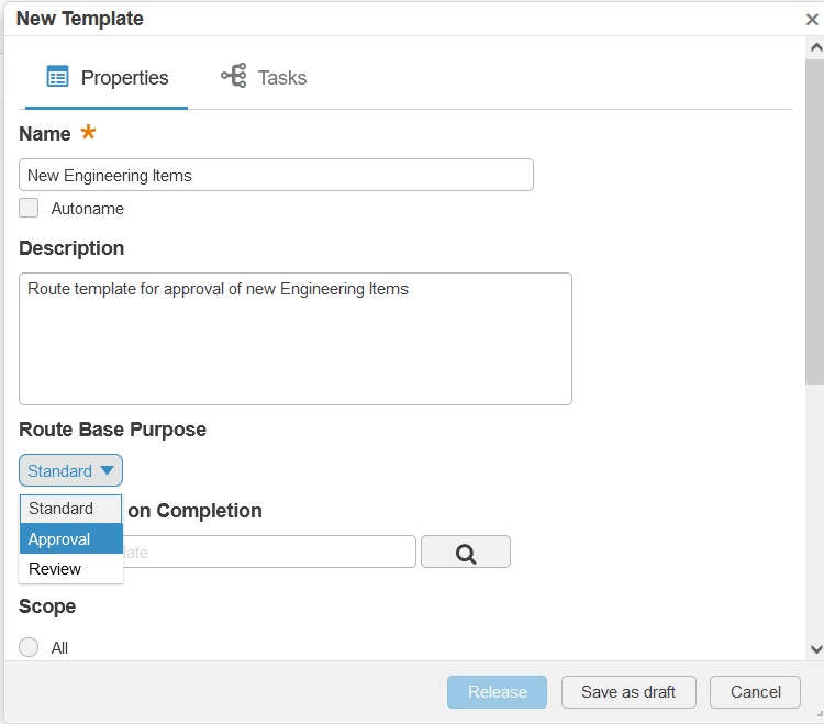 In order to enable the usage of a route in the approval process of the Change Action, route templates should be created and released. The “Route Base Purpose” attribute of the route template should be of type “Approval”: