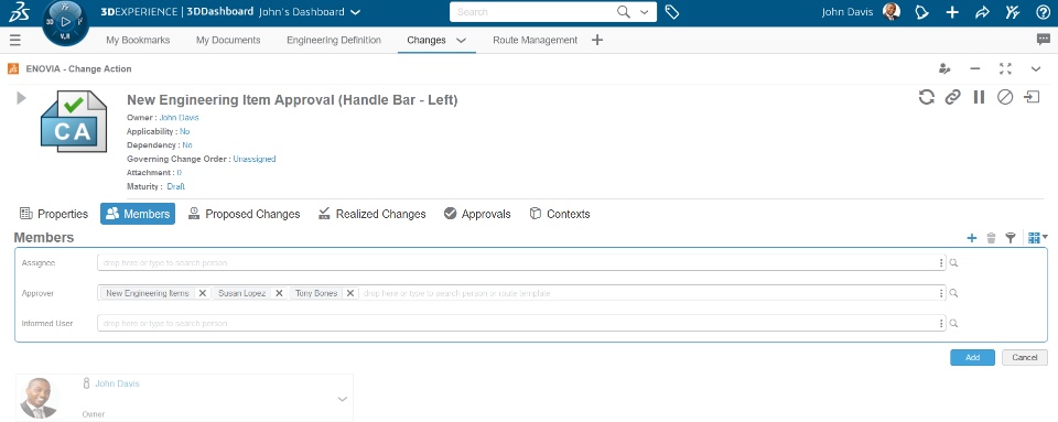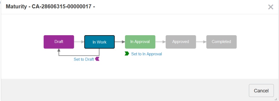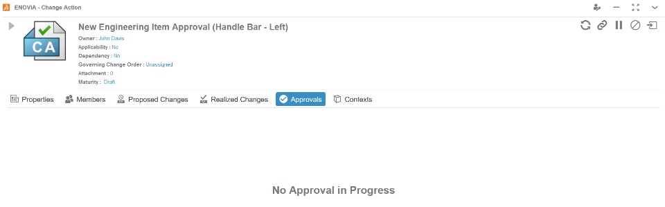 Setting the Maturity state of the Change Action to “In Approval” will initiate the process: