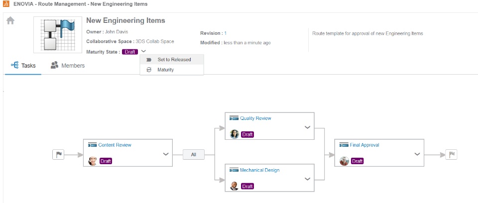 Routes are collections of tasks assigned to one or more people in the organization. Routes can be used to provide information on actions required as part of an approval process; for example an approval of a document. In the case of a Change Action to define the tasks and instructions required to approve that Change Action. Upon completion of the route, the Change Action will then be completed and subsequently, the “In Work” items in the ‘Realized Changes’ would be promoted to “Released” lifecycle maturity state.
