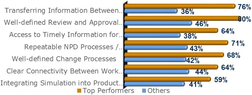 PLM can do more than improve engineering and design processes. Our recent research, How to Stop Missing Product Development Due Dates, finds that in addition to improving engineering efficiency, 60% of companies see even greater benefits by improving process efficiency. PLM drives better collaboration and project execution, which multiplies the benefits of improving individual engineering and innovation time. The result is faster time to market and more time to innovate leading to higher profitability. The study shows that companies that excel in product development performance have more advanced capabilities supported by PLM.