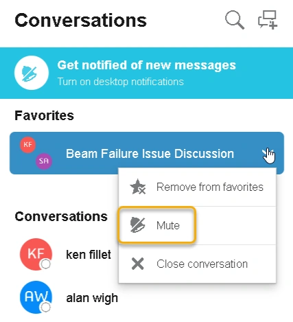 If you no longer need instant notifications but still want to stay informed as part of the group, this new enhancement enables you to mute the specific conversation, using a new option “Mute” that is available in the context menu of both 1:1 and Group Conversations.