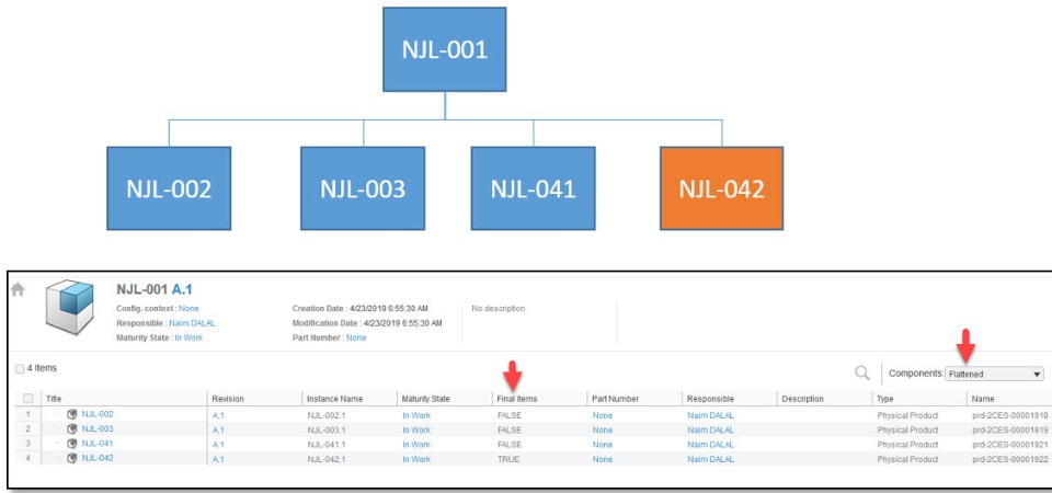 - If we select the option “Flattened” in the same root item NJL-001, then it will display any direct child item that does not itself have children (“Leaf Items”), or any other item that has been identified as a “Terminal Item”.