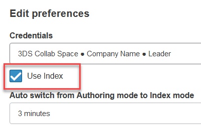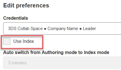 When the ‘Use Index’ setting is turn on, the index mode is the default mode. You can then switch manually between index mode and authoring mode using the ‘mode’ icon in the toolbar.