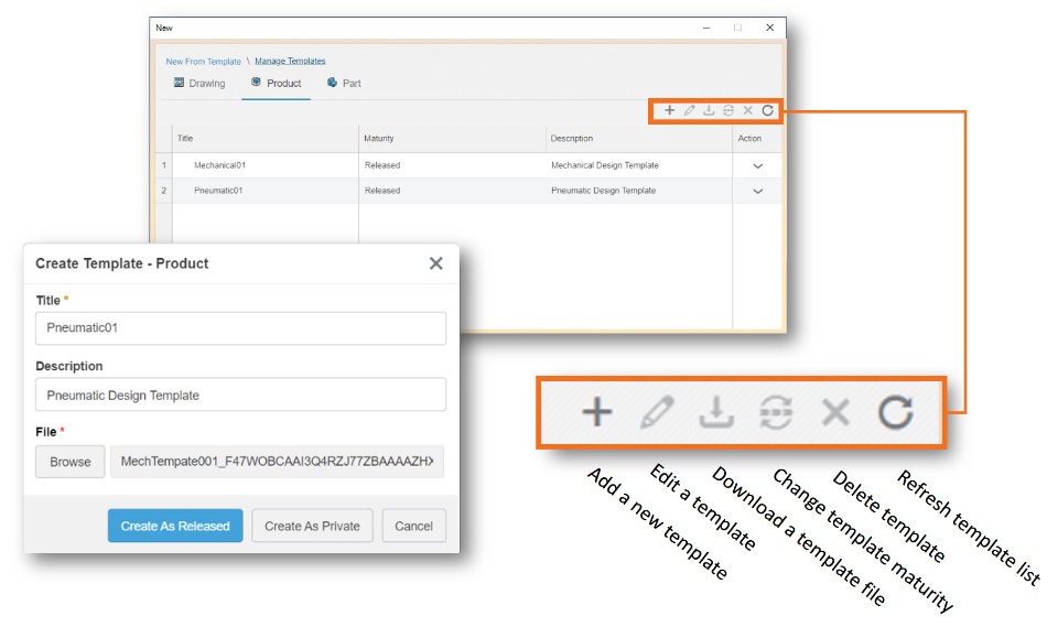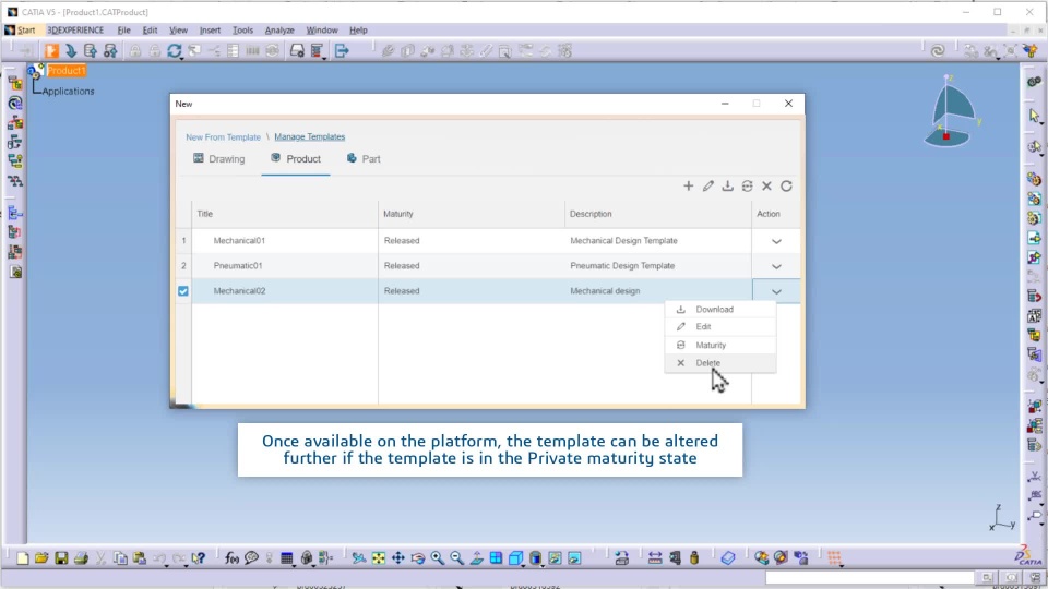 The CATIA V5 offers a unique feature in the prompt allowing the user to promote the maturity of the template to either “Released” or “Private”. “Private” maturity state limits the visibility of the template to the user who created the template.