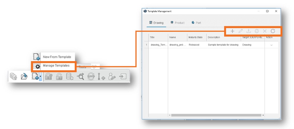Each CAD integration implements the usage and management of templates uniquely to the user interface (UI) of the CAD product. But, the choices within the UI are consistent. Here is the integration for CATIA V5.