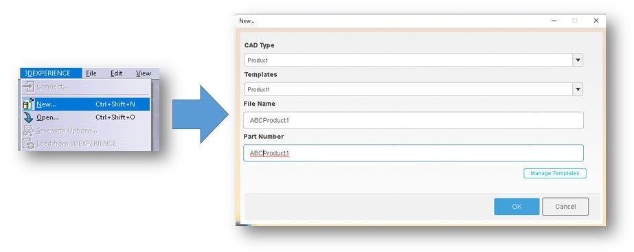 Selecting the “New” command presents the user with a categorized list of templates based on assemblies (products), parts, or drawings. Once selected, a refreshed list of templates appears for the selected category. Once selected, the user optionally fills in any preliminary properties offered by the prompt. Once you choose the OK button, the file is saved to the cache of the CAD system and opens it into session. At this point, the assembly, part, or drawings are not saved to the platform, which is consistent with the standard “New” command available in the CAD interface. Various commands are also available to manipulate the templates. The following images illustrate the commands within CATIA V5.