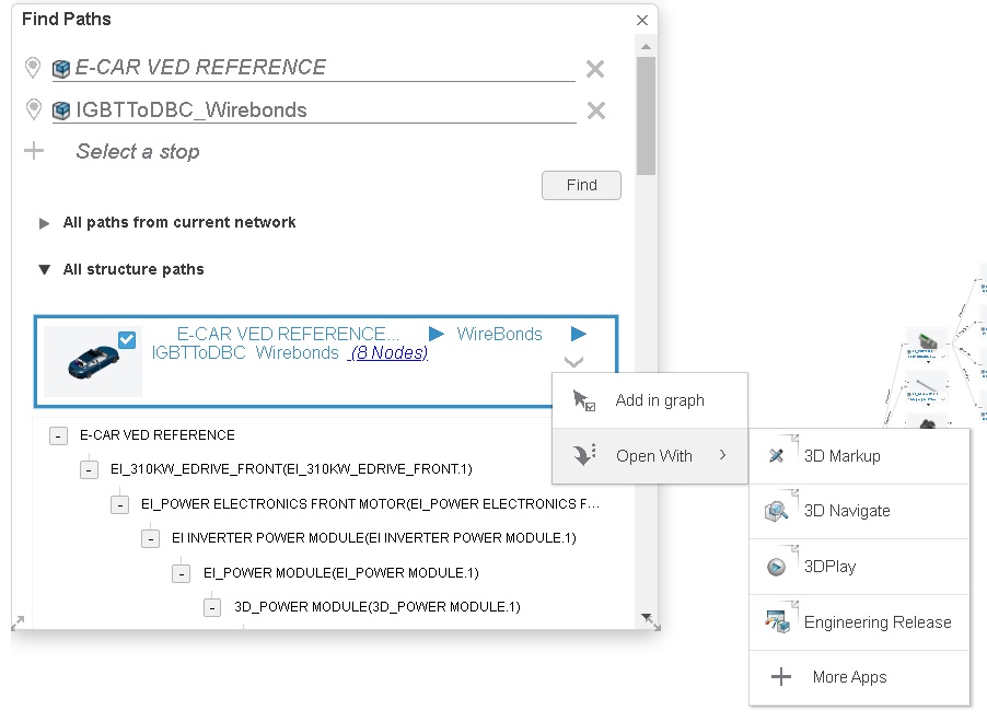 The paths shown in this section are computed based on the all the loaded relations in the view. You can drag-and-drop the path in the required app or you can use the context menu option to open the path/object, in the required app.