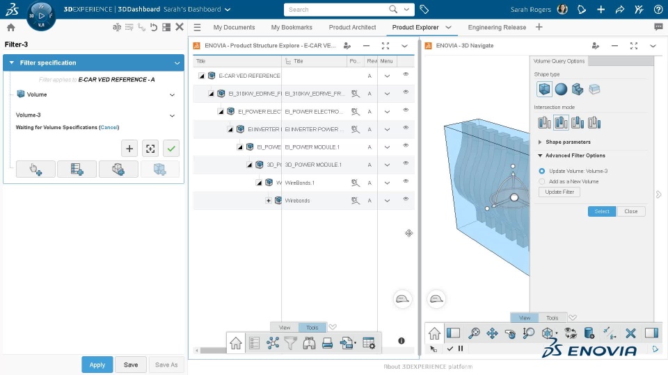 To make this happen seamlessly, you can open the relations of the given product. In the Relations app, use the “Where Used” relations to explore its parent until the root. Use the Find Path option to highlight the path between selected product and its root. Now, using the context menu option of the structured path, open the product along with its root in the Product Explorer app. This is one of the easiest methods to obtain the context required to open a product along with its root to perform a volume filter query.