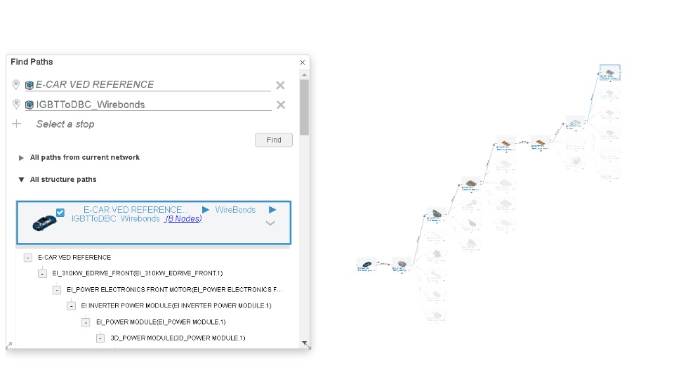 In this blog, you will become familiar with the way you can use the Find Paths command in the Relations widget. This command allows you to find and highlight all the paths between any two objects in the relation structure without the need to go through a complex and lengthy search process. The Find Paths panel allows you to select a start point (object) and one or multiple stop points (objects) of a path. This command is useful when you are using the Where Used relations set that shows the Parent-Child product relations. This command is available within the fly out options in the Relations widget. Here are some usecases that illustrates the find path usage: