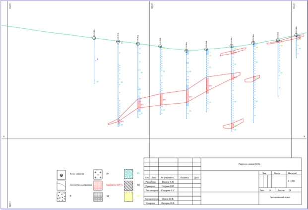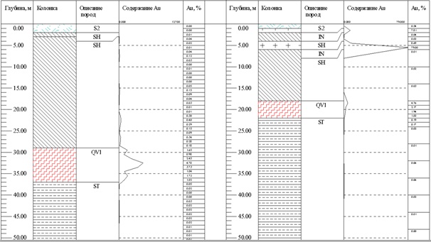 Например, печать литологической колонки скважины или серии скважин с необходимыми характеристиками: штриховкой литологии, литологическим кодом, описанием пород, содержанием полезных компонентов в виде значений или графиков, различными геотехническими и любыми другими данными, содержащимися в геологической базе данных.