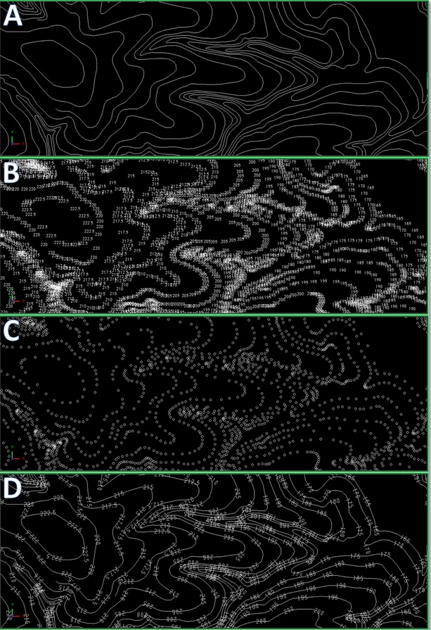 Для примера отобразим один и тот же стринг в виде линий (A), данных поля Z в каждой точке (B), маркеров точек (C), изолиний (D).