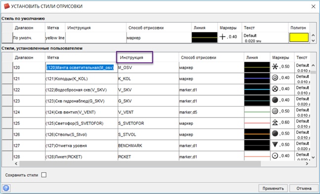 Инструкция печати – это формат, который присваивается отдельному номеру стринга в окне Установить стили отрисовки меню Показать-Свойства-Стрингов и Точек и определяет способ отображения стринга при печати.