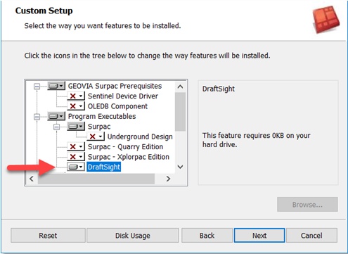 DraftSight устанавливается в процессе инсталляции GEOVIA Surpac. Для этого необходимо в окне выбора компонентов установки сделать DraftSight активным для установки.