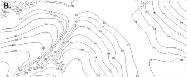 Такая система настройки печати графических данных имеет преимущество в отображении в рабочем графическом окне и на листе бумаге только необходимой информации. В работе избыточная информация будет только мешать и загружать ресурсы компьютера, поэтому такие данные не визуализируются в рабочем окне, но при печати они могут отображаться в требуемом виде. Например, при печати изолиний в графическом окне изолинии могут отображаться как простые линии (А), а на печать выводятся уже с высотными отметками (В).
