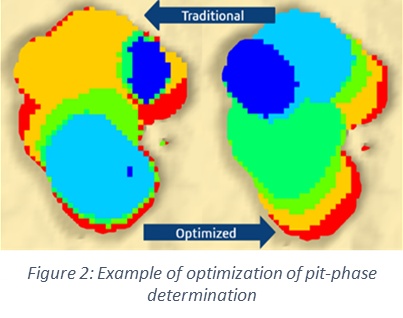 After knowing the best starting point based on the strategic objectives, this exercise will respect several operational restrictions that will reduce the impact of the operational mining design on the VPN obtained from the optimal phases (pit-shells), minimizing the loss of value. (Fig. 2).