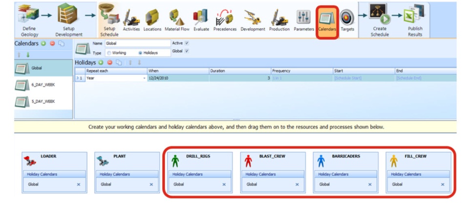Antes de calcular la secuencia, se debe revisar y crear los calendarios para cada recurso asignado (si aplica) o si hace parte del calendario global.