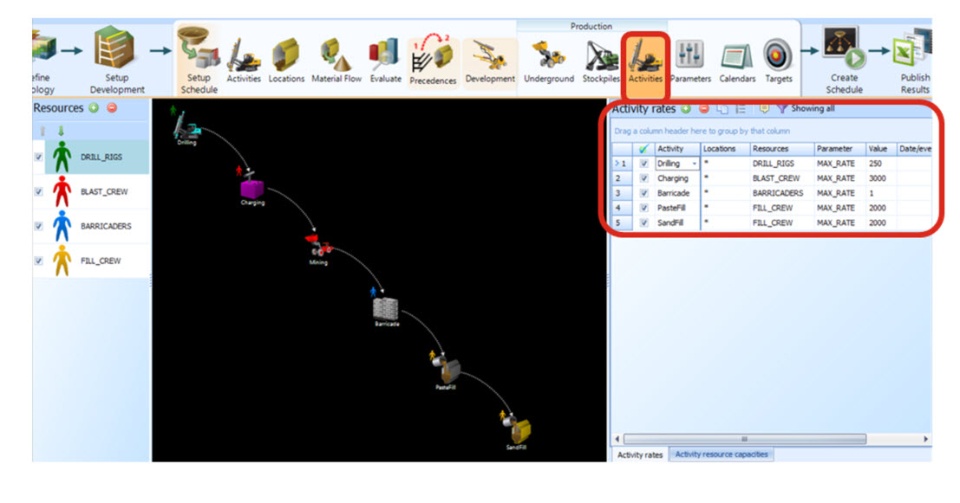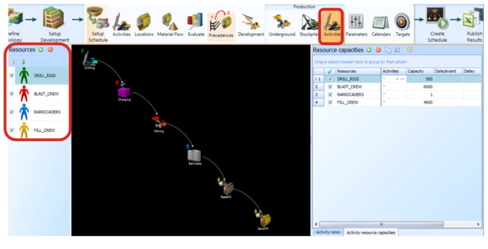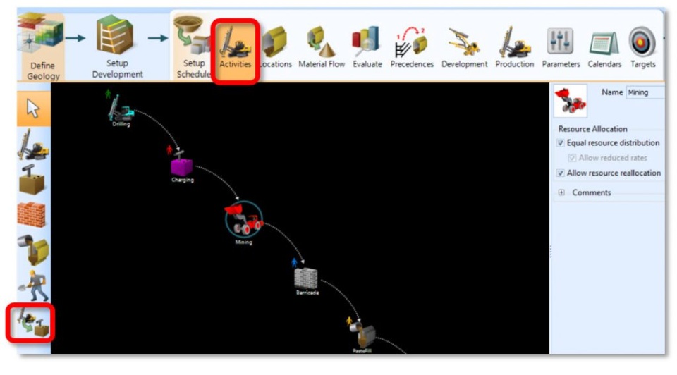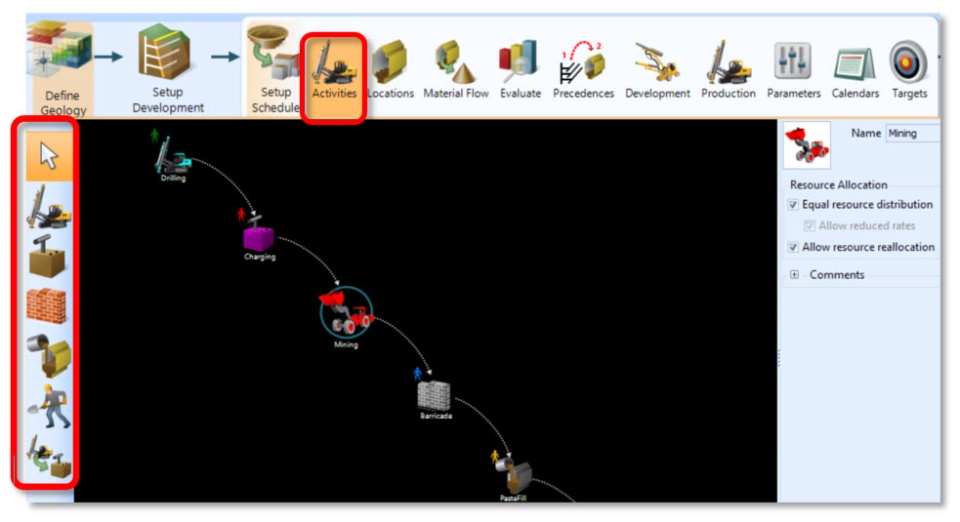 En GEOVIA Minesched existen cinco tipos de actividades auxiliares configurables:
