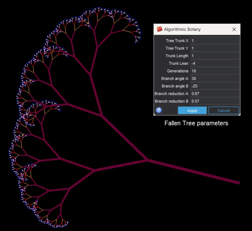 Fractal trees fall under a larger concept called algorithmic botany, whereby certain algorithms can be used to describe plant growth. The example attached and shown below is based on a L-System (Lindenmayer System) however doesn't follow the symbolic path that the typical L-System uses. (I will cover that in a subsequent post.)