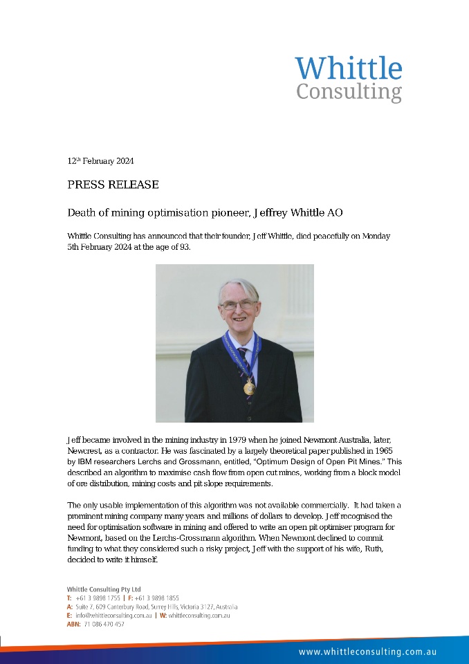 Jeffrey's passion for software development and his unwavering commitment to excellence propelled Whittle software to great heights, revolutionizing the way we approach mine planning. His visionary leadership laid the foundation for the remarkable advancements and achievements we continue to celebrate today.