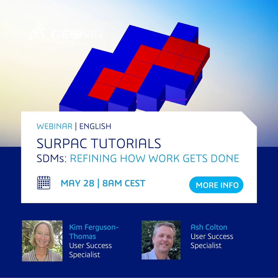 📝 Join us as two of our GEOVIA in-house experts, @CC, @Kim FERGUSON-THOMAS and @Ash COLTON, share their best practice on Surpac. In this episode, they will cover SDMs, followed by a 10-minute open-to-the-audience Q&A session.