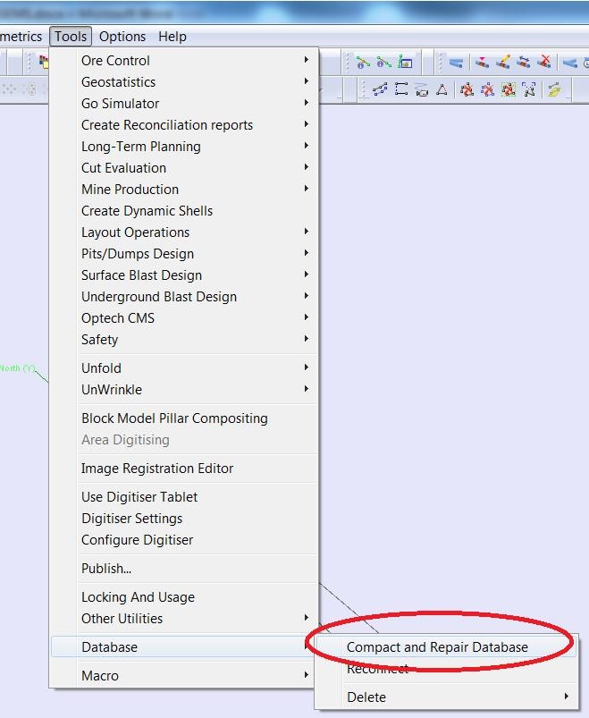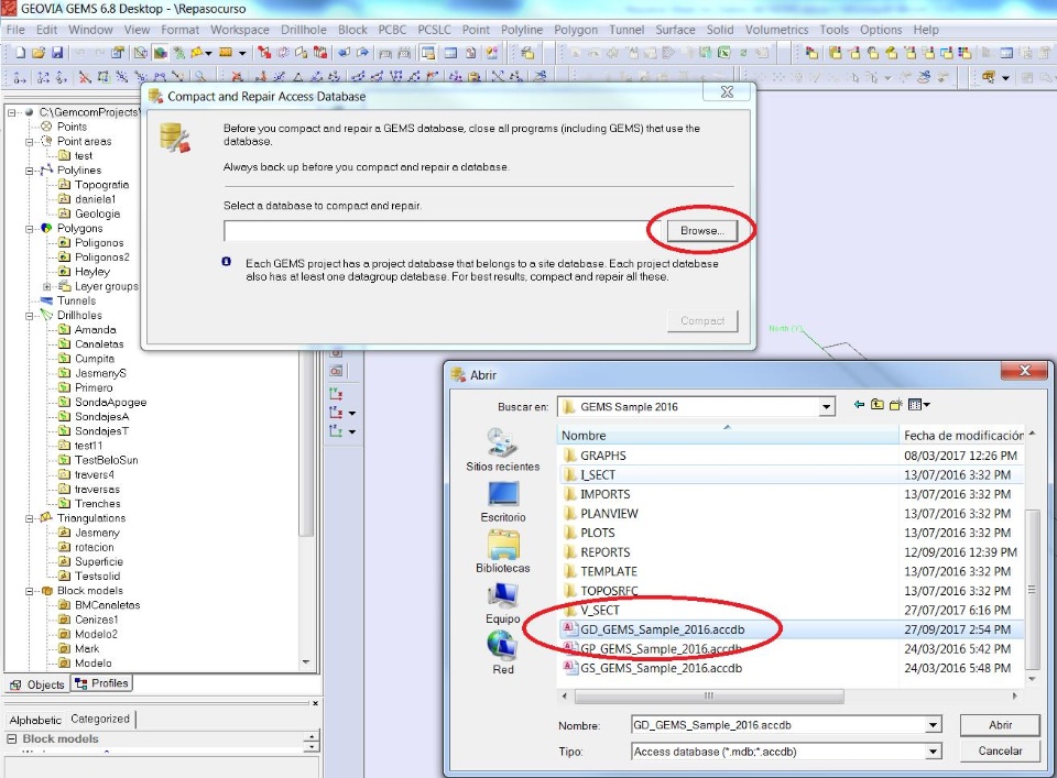 Si es que el tamaño reducido no es suficiente para seguir trabajando podemos tomar la opción de borrar desde el mismo proyecto GEMS la información inservible o redundante. Por ejemplo, superficies antiguas, modelos de bloques no utilizados, líneas topográficas en desuso, sólidos duplicados, etc. Luego de hacer esta limpieza podemos aplicar el procedimiento Compact and Repair nuevamente.