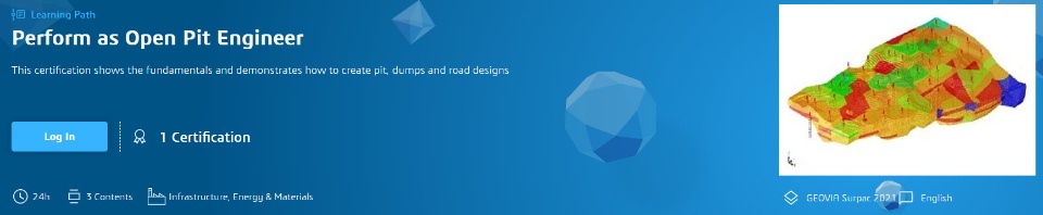 The Perform as Open Pit Engineer course is divided into three learning modules that teach users how to create pit, dumps and road designs.