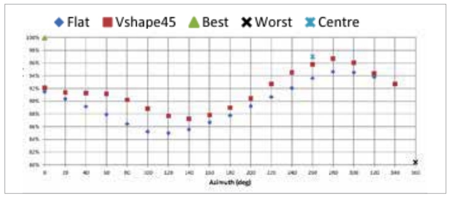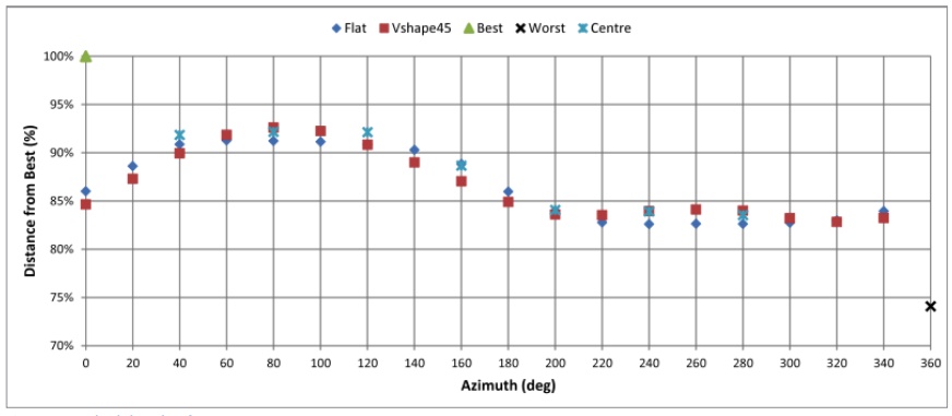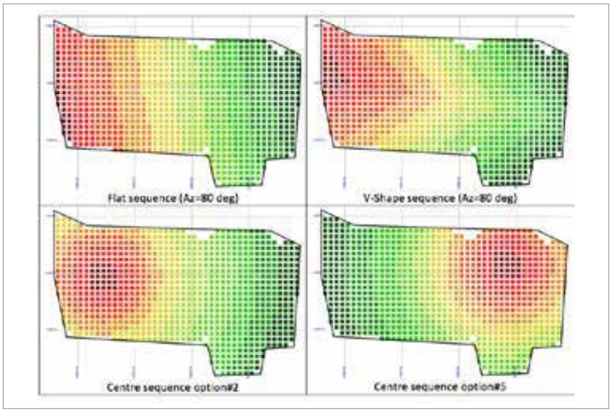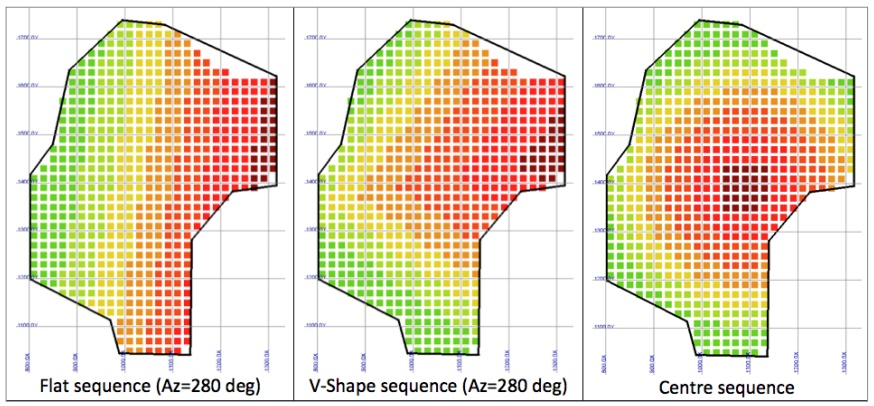 Figure 16 shows four of the best alternative sequences for this zone, with the start of the sequence shown in warmer colors. In this zone, the results using a flat or V-shape are very similar. Surprisingly the option to start in the center was not better than the others. This is an indication that any of the best shape options could be used. Taking into consideration the complexity of the operation the best sequence is using a V-shape with an azimuth of 80 deg.