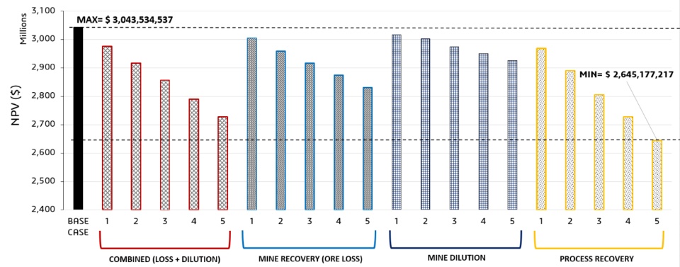The ‘strategic scenario-based analysis’ below implies how ore dilution and ore loss could potentially diminish or improve NPV of a copper mine.