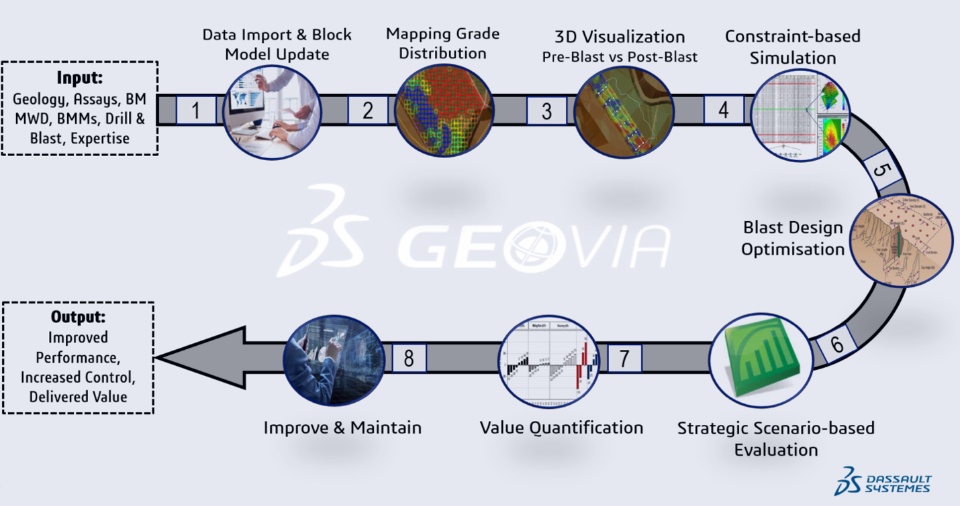 The solution developed at Dassault Systèmes uses globally-trusted, multi-functional software packages that are also capable of dealing with blast-induced ore loss/dilution problems. The workflow below illustrates key steps critical for mitigating risks associated with poor blasting – i.e. ore loss/dilution.