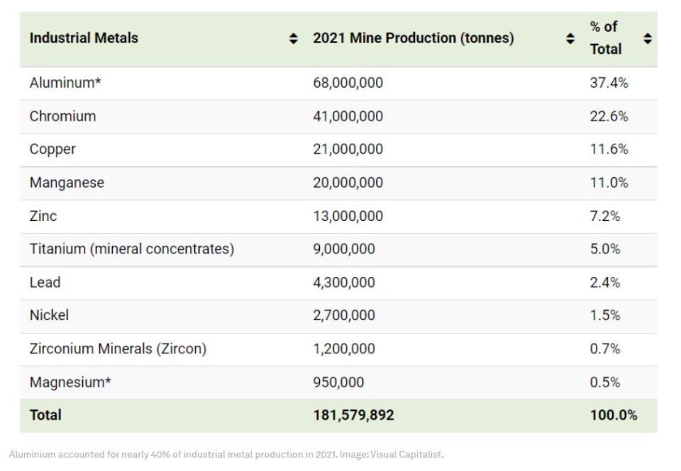 Industrial metals are largely used in steelmaking, construction, chemical manufacturing, and as alloying agents. In 2021, the world mined over 181 million tonnes of these metals.