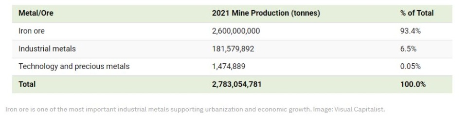 Iron ore accounted for 93% of the metals mined in 2021, with 2.6 billion tonnes extracted from the ground. It’s important to note that this is ore production, which is typically higher than metal production since metals are extracted and refined from ores. For example, the iron metal content of this ore is estimated at 1.6 billion tonnes.
