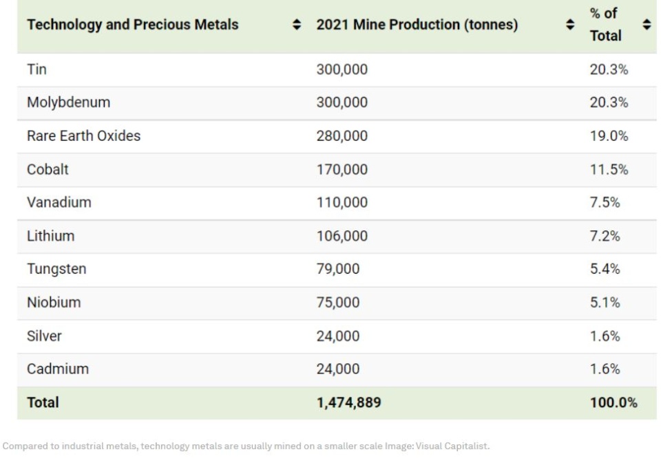 Technology metals include those that are commonly used in technology and devices. Compared to industrial metals, these are usually mined on a smaller scale and could see faster consumption growth as the world adopts new technologies.