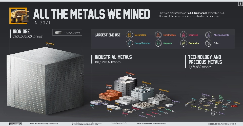 The above infographic visualizes all 2.8 billion tonnes of metals mined in 2021 and highlights each metal’s largest end-use using data from the United States Geological Survey (USGS).